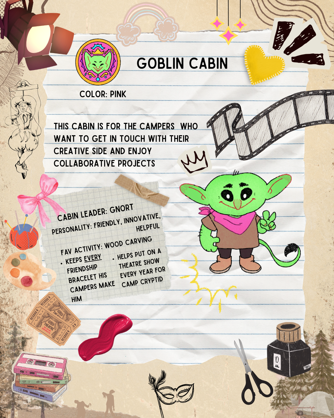 Gnort is the Goblin Cabin leader! He encourages creativity and collaboration among his campers, especially in their theatrical activities! He keeps everything his campers make for him, no matter how 'inexperienced' they may look.