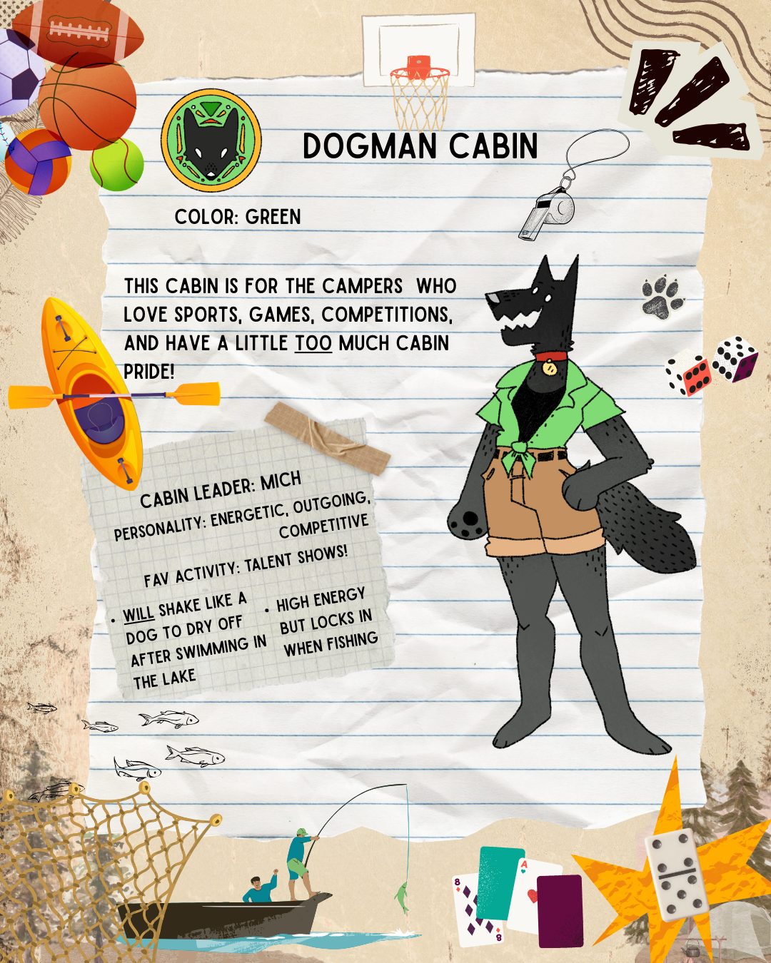 Mich is the leader of the Dogman Cabin! They value teamwork, fairness, and sportsmanship, and often encourages campers to work together and support one another! Their favorite activity is early morning fishing with the Wulver.