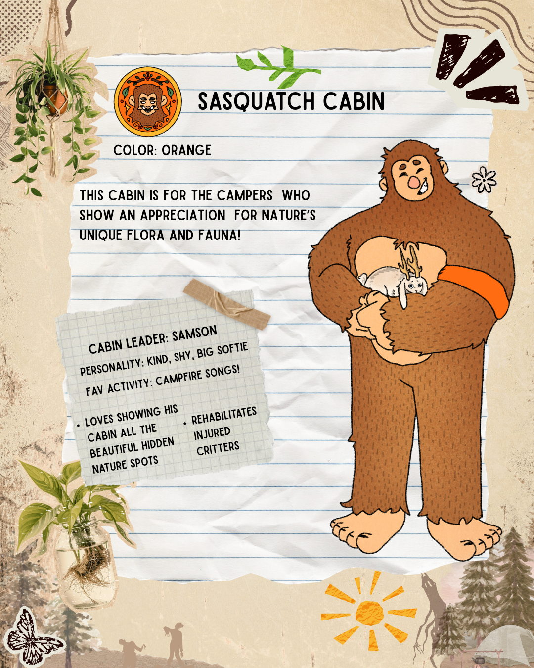 Samson is the leader of the Sasquatch Cabin! He's a quiet, shy, sweetheart with a special soft spot for rehabilitating injured plantnd animals. He prefers taking in the quieter campers and showing them the true beauties nature has to offer!